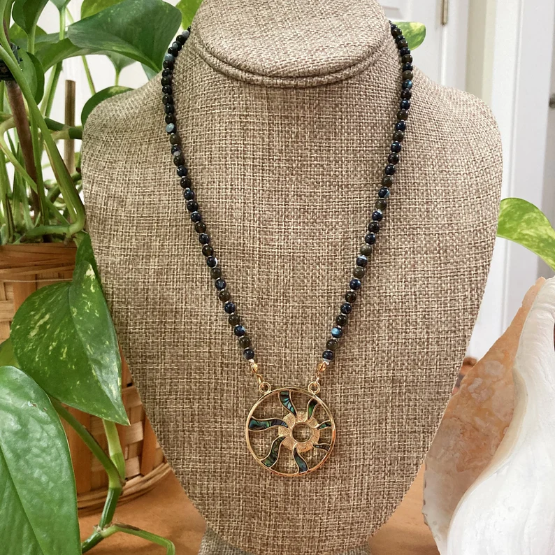 30 July 2024Categories Sun Pendant, Abalone Shell Sun, Beaded Necklace, Shell Beads, Stone Beads, Hand Knotted on Silk Cord, Autistic Artist, Paranal